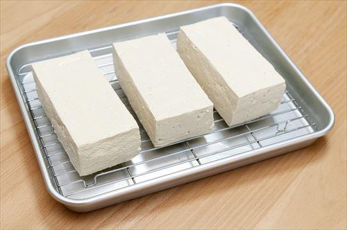 豆腐に重しをのせ水分を出す方法だ。加熱しないため、豆腐のなめらかさを生かす料理に向いている。手順は、キッチンペーパーで包んだ豆腐に重しをのせ、30分以上放置する。最後に乾いたキッチンペーパーで水気を拭き取り、完成だ。