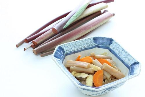 ずいきは食べたことがない人も多いと思うが、煮物やおひたしにするととても美味しい。生のずいきはアク抜きが必要だが、下処理をして冷凍しておけばいろいろな料理が作れる。シャキシャキとした独特の食感や味わいが面白いので、ぜひこの機会に試してみてはいかがだろうか。