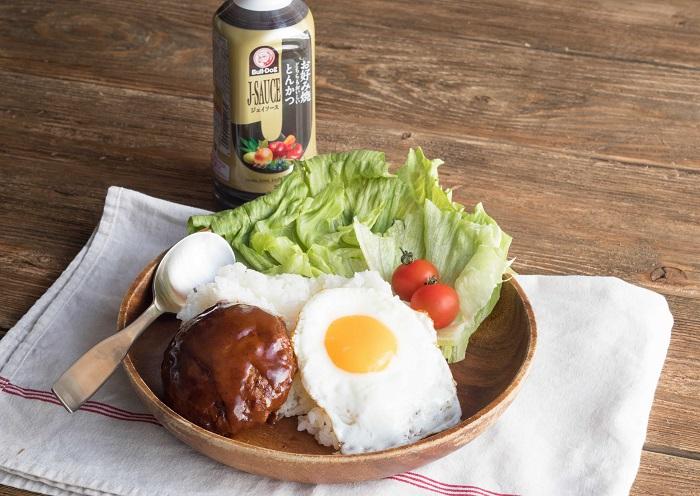 続いて、ロコモコ丼。お皿にご飯、ハンバーグ、目玉焼き、レタス、プチトマトを乗せて、『Jソース』をかけるだけ!通常、ロコモコ丼のタレといえばケチャップにウスターソースなどを混ぜて作るが、『Jソース』があればタレを作る必要なし。「食材の味を邪魔しない」「簡単!」とオリひと編集部でも人気が高い使い方だ。