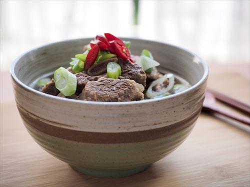 鍋にごま油を熱し、にんにくを炒める。香りが出てきたら、牛カルビを入れて塩こしょう、酒を入れてサッと焼き上げる。牛カルビに焼き色がついたら、ねぎの青い部分と水を加えて煮立たせる。この時、アクが出るので、アクを取りながら煮込む。人参や大根、ねぎなどを加えてさらに煮る。仕上げに塩こしょうで味を調えて完成だ。
