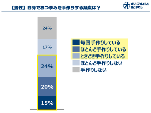 お酒とともに食べるおつまみに関しても調査したところ、男性のおつまみ事情について、興味深い結果が得られた。男性の宅飲みのおつまみとして最も多いのは「食事のおかず」だが、「手作りのおつまみ」が3位にランクイン。おつまみを自作する頻度についての質問に対し、なんと約6割の男性が日常的に手作りしていると回答したのだ。自宅での生活時間が増えたことで、男性の料理頻度は高まっているが、おつまみについても自分好みのものを手作りする機会が増えているようだ。