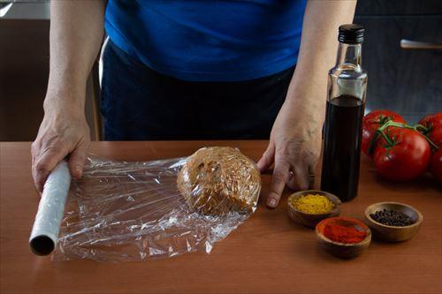 - ハンバーグのタネを成形して1個ずつラップで包む