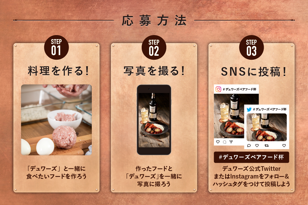 デュワーズ公式Twitter( @dewars_jpn )、または、公式Instagram( dewars_jpn )をフォローした上で、TwitterまたはInstagramで「#デュワーズペアフード杯」のハッシュタグをつけ、写真を投稿する。「デュワーズ」との相性の良さや、レシピのこだわりポイントをアピールしてほしい。
