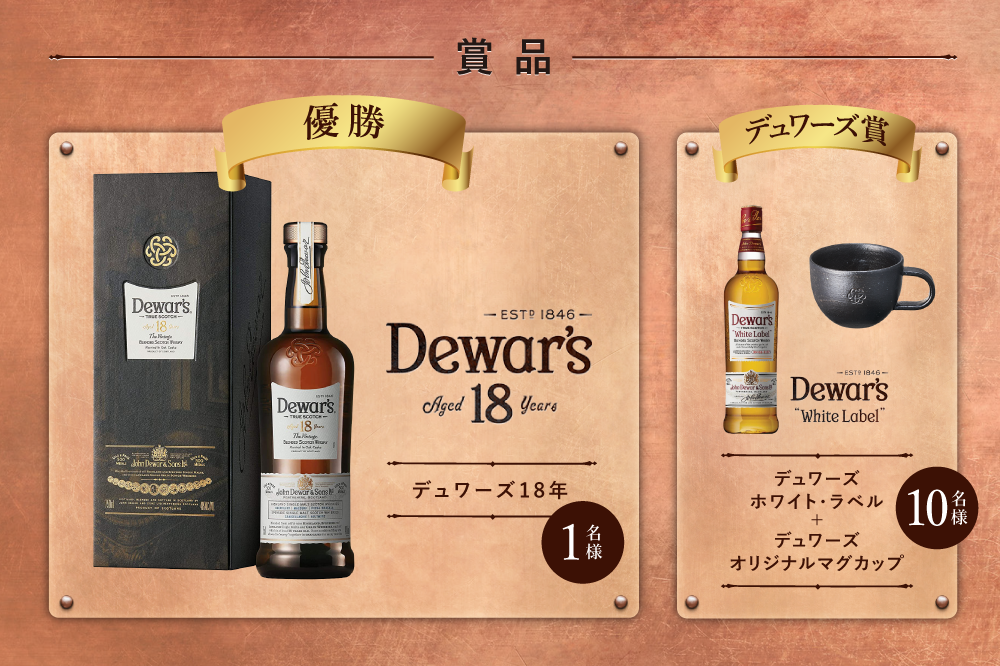 栄えある優勝に輝いた方には、『デュワーズ 18年』をプレゼント。18年を飲んだことない方は、ぜひ優勝を目指してほしい。