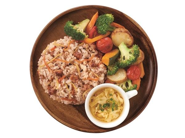 『もち麦と雑穀の大豆ミート入り炊き込みライスの素』は、前述の通り、もち麦、雑穀に加え、大豆ミートが入っているので、栄養バランスが非常によい。あとは季節の野菜を使ったスープやサラダを簡単に合わせ、ワンプレートにすれば、お手軽ヘルシー献立の完成だ。
