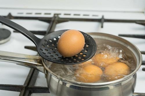 ゆで終わった卵は氷がある場合は氷水につける。もしなければ冷水で一気に冷やせばよい。冷水につける理由は殻が急激に冷えると、中身から出る水蒸気が冷やされ、中身と殻の間に水がたまる。すると殻と中身が収縮してズレるため、きれいにむきやすくなるからだ。また、冷水につけると黄身の中心に残る熱がとれ、好みのかたさに仕上がる。