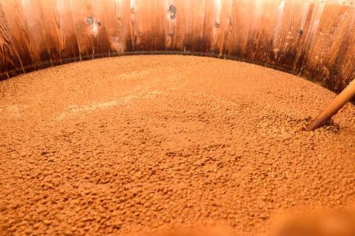 大豆は蒸煮して、小麦は焙煎(「炒ごう」という)した後細かく砕きます(「割砕」という)。蒸煮大豆と炒ごう割砕小麦を混ぜて、これに種麹を植え付けて培養します(「製麹せいきく」という)。できあがった醤油麹を、木桶またはタンクの中で1.2倍くらいの食塩水に漬け込みます。この状態を「もろみ」といいます。