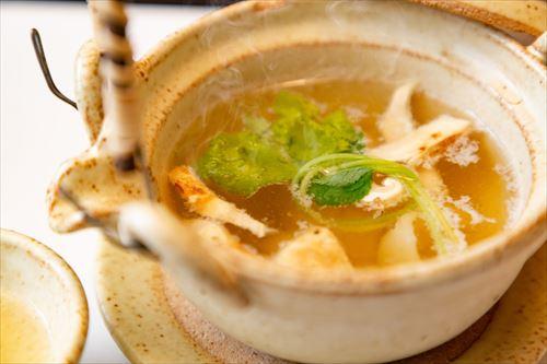 煮立ったらしいたけと豆腐を加える。再び煮立ったら三つ葉を入れひと混ぜする。温泉卵を割り入れたお椀に注げばお吸い物の完成だ。しいたけの香りがふんわりと漂うやさしい味のお吸い物で、炊き込みごはんやちらし寿司と一緒に食べるのにおすすめ。
