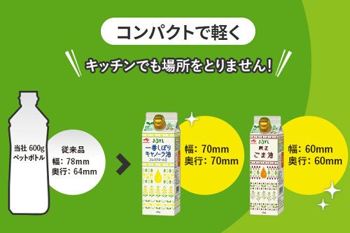家庭で使う油は、プラスチック容器に入っているのが一般的である。ここに着目し、より環境に配慮した商品を開発したのが、J-オイルミルズだ。今回新発売されたのが、JOYL「AJINOMOTO 一番しぼりキャノーラ油」とJOYL「AJINOMOTO 純正ごま油」の2商品。たとえば「AJINOMOTO 一番しぼりキャノーラ油」においては、同社600gのエコペット容器と比較し、プラスチックの使用量を約60%削減。これに伴い、CO2に関しても26~34%の削減を見込んでいる。