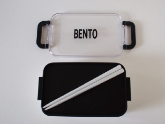3COINSの1段ランチBOXの特徴は白と黒のモノトーンカラーと「BENTO」の英字ロゴだ。ロゴは透明の上フタにプリントされていて、その下には黒の中フタがある。中フタの上には箸をセットできる溝が付いていて、この溝にぴったりはまる白い箸も付属している。
