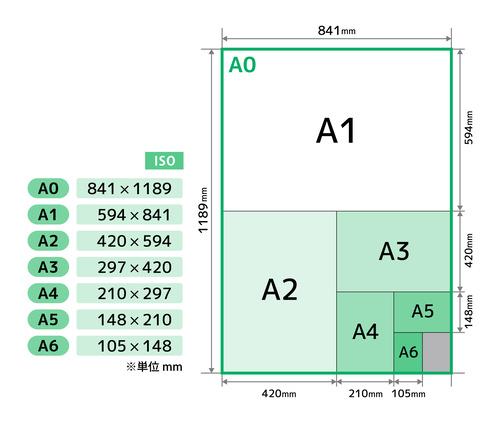 A判の最も大きいサイズ、A0が841×1189mmで面積が1m2(平方メートル)、A0の半分のサイズがA1、さらに半分がA2と数字が1増えるごとにサイズが半分になる。A4はA3の半分でA0の1/16であり、実際の各辺の長さは210×297mmだ。