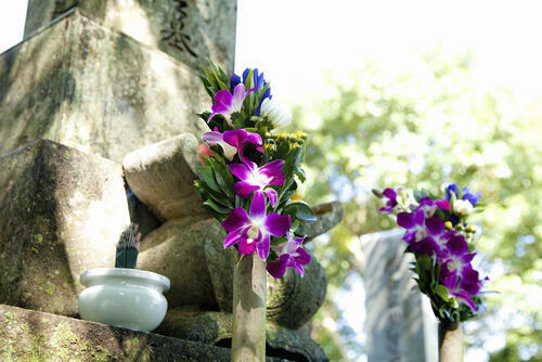 ・墓周りの掃除をすませてから水をかけ、合掌礼拝をする。