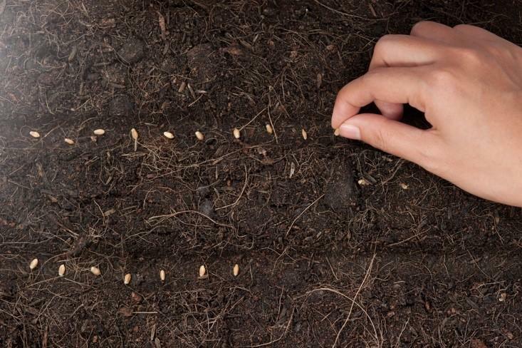 土に約1㎝の溝を作り、1粒ずつ2cm間隔くらいで種をまき、上から軽く土をかぶせて、手のひらで優しく押さえる。ジョウロで水をやったら種まきは完了だ。