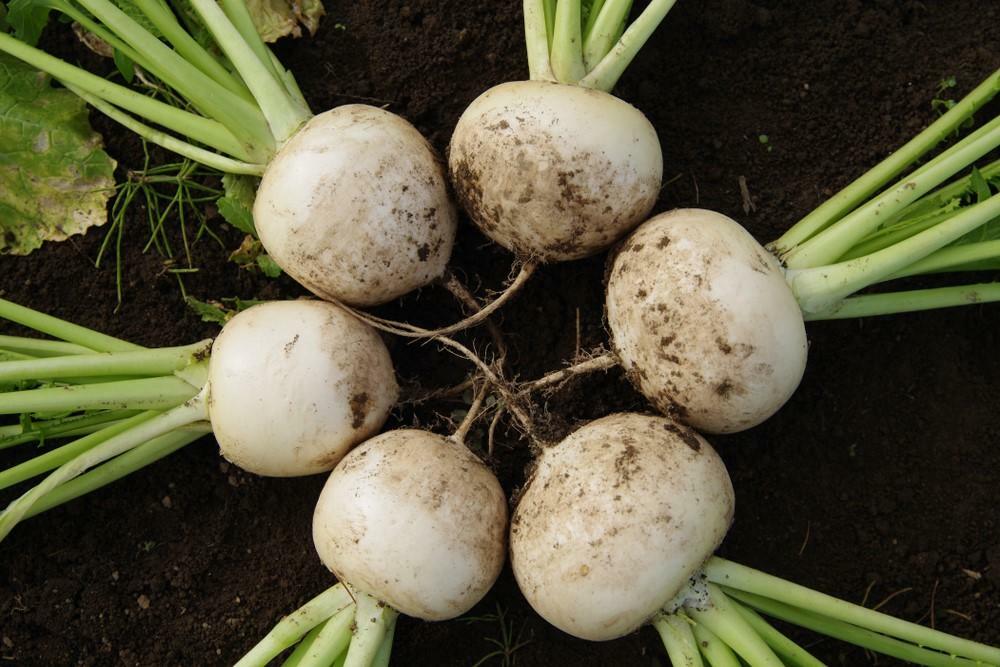 春まきでも秋まきでも、種をまいてから収穫するまでは約40~50日。白くふっくらしたカブは、生でスライスしても漬物にしても、煮たり焼いたり炒めたりしても美味しい。カルシウムが豊富に含まれる葉も、余すところなく大事にいただこう。