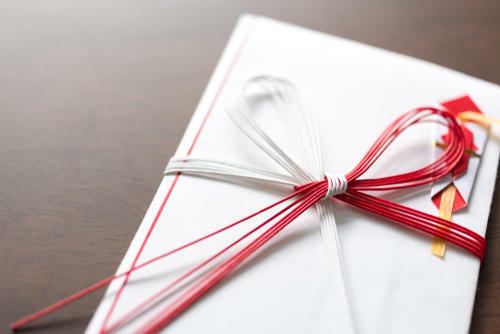 お祝いの品にかけるのし紙や現金を包む封筒は、紅白の水引を選ぼう。結び方は、引っ越しや昇進など、何度祝ってもよいお祝いごとに対して用いる蝶結びにするのがマナーだ。華美なものではなく、シンプルなものでかまわない。