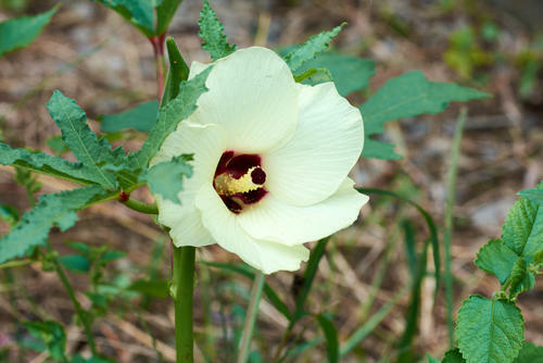 オクラはアオイ科の植物。ハイビスカスやムクゲなどと同じなので、美しい花が咲く。中心部が濃い紫色で花びらは薄黄色。南国を彷彿とさせる花だ。この花の根元が実として成長していく。