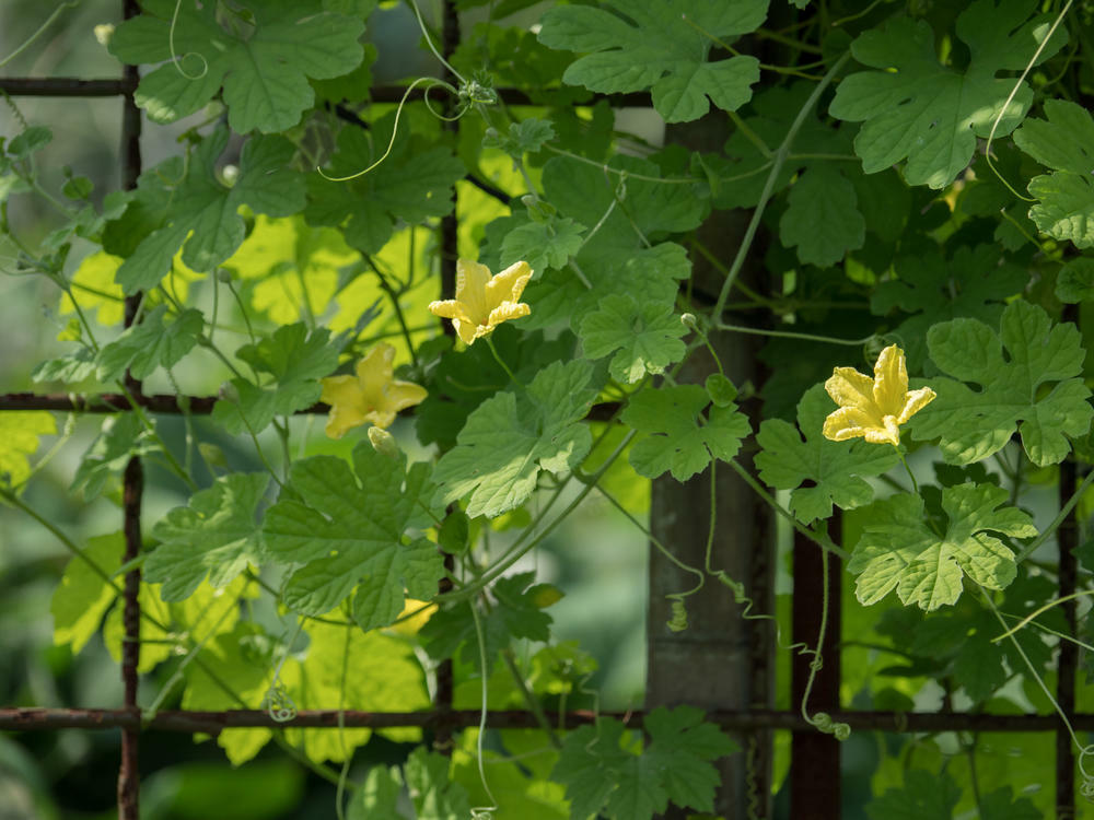 苗を植えてから約1か月で花が開く。花の下に膨らみがあるのが雌花、ないのが雄花。朝、咲いたばかりの雄花を摘んで、雌花の雌しべに花粉をつけてやると、実がなる確率が上がるので、グリーンカーテンだけでなく食用のゴーヤもちゃんと実らせたいなら、この方法で人工授粉をしてみよう。