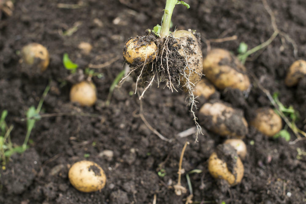 緑色の茎と葉が勢いよく育ち、花が咲いている頃に掘り起こせば、みずみずしい新じゃがが収穫できる。その後、花が散り、茎と葉が黄色くなった頃には、さらに大きなじゃがいもに育っているので、本格的な収穫を。たくさん株を育てたなら、新じゃがの季節から少しずつ時期をずらして収穫が楽しめる。