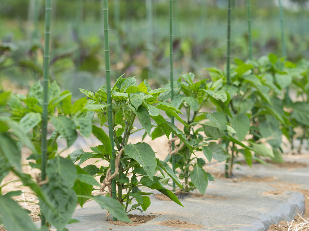 ピーマンは太陽を浴びてぐんぐん育ち、結構背が高くなる。その間に強風に煽られたりすると、ポキッと折れてしまうので、支柱に沿わせた方が良い。苗が小さいうちは、割り箸や園芸用の細い支柱でOK。少し育ってきたら、長さ150㎝くらいのしっかりした支柱を使う。