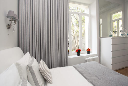 寝室に強い光が入る寝室には、高い等級の遮光カーテンでコーディネートすることをおすすめする。