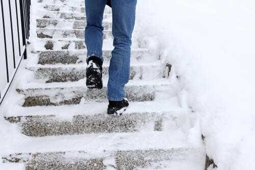 階段が凍結する地域におすすめなのが、足で踏むと氷が割れるタイプの滑り止めマットだ。マットの内部が空洞やスポンジ素材になっていて、踏むとマットがへこむので、マットの表面にはった薄い氷を割ることができる。スリップによる転倒を防ぐ効果があるうえ、氷を除去するのも簡単で、凍結の時期になったら置くだけでいいので手軽で、ランニングコストもかからないというメリットがある