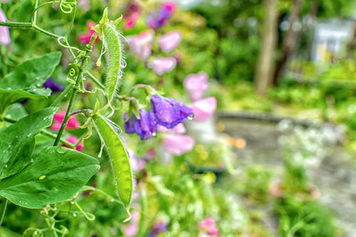 茎の下から花が咲き始め徐々に上へ移動する。収穫も下から順番に始まる。さやの長さが5~7cmくらいになると収穫時だ。豆が膨らむ前がさやえんどうの食べ頃だ。