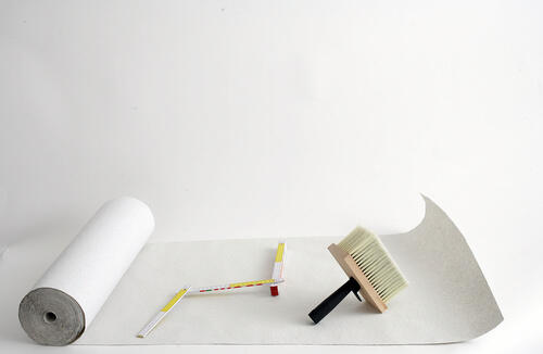 - 壁の前に移動し、壁紙を足元に置いてから天井に向かって広げていく