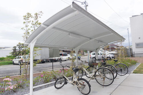 ひとつめの雨よけは「サイクルポート」、つまりカーポートの自転車版だ。しっかりした柱と屋根で自転車を日差しや雨から守ってくれる。耐久性が高く、複数台の自転車を停められるが、設置スペースが必要になる。
