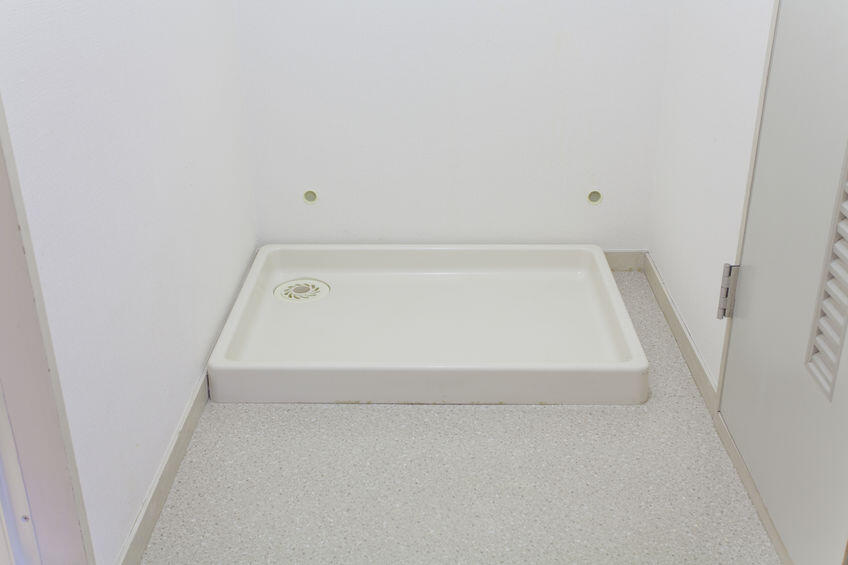 かさ上げや凸凹がない、プレートタイプの防水パン。さまざまな種類の洗濯機に対応しやすい反面、洗濯機の下に隙間ができず掃除がしにくいというデメリットもある。