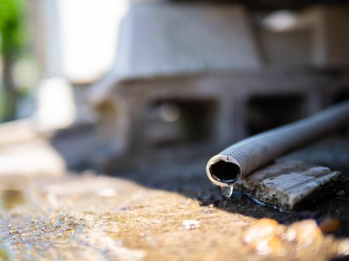 室外機から水が出るのは故障ではないが、ウッドデッキの上や、マンションやアパートのベランダなど室外機の設置場所によっては、周辺への水漏れが気になることもあるだろう。その場合は、室外機にドレンホースを取り付けて対処しよう。水が出ることは防げないが、排水を指定の場所に誘導することは可能である。