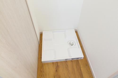 防水パンの四隅が高く、洗濯機を設置すると下に枠で囲まれた空間ができるタイプだ。空間がある分フラットよりも掃除しやすいが、手の届かない部分まで掃除するには洗濯機を移動させる必要がある。