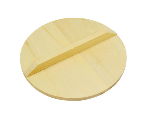 木製の本格的な落とし蓋がこちら。15cmから24cmまで各サイズが揃っている。持ち手と蓋は、接着剤やクギなどを使わない「あり溝加工」で取り付けられている。食品に使うものなので心配りがうれしい。