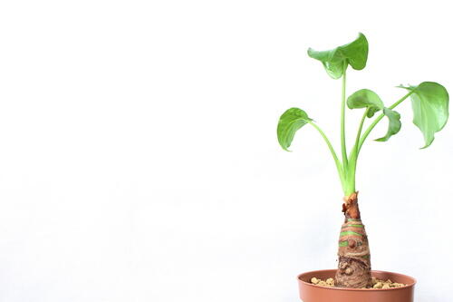 クワズイモは地上に出た太く膨らんでいる根と、その根から伸びてくるハート型の葉が魅力的な植物だ。オシャレな見た目から、お店のディスプレイなどによく活用されている。また、クワズイモは成長が早いため、別名「出世芋」とも呼ばれており、就職祝いなどのギフトにも用いられている。育て方も比較的簡単で初心者にもおすすめの観葉植物となっている。