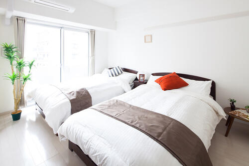 シングルベッド2台分を1枚でスッポリと包むことができるボックスシーツを使う。幅200㎝のボックスシーツを使えば隙間やマットレスのズレを気にせずに寝ることができる。