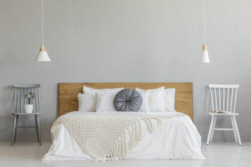クイーンやキングサイズのベッドを配置する場合、壁につけずにあえて中央に配置する。ベッドの存在感を強調して、ベッドサイドテーブルなども小ぶりなものを置くといいだろう。