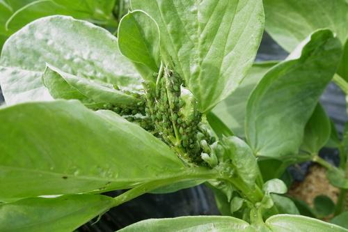 そら豆は野菜の中でも特にアブラムシが付きやすい作物だ。アブラムシが発生しやすいのは、定植後すぐと収穫前の4月である。定植後の発生には、種まきや定植時に殺虫剤を土に散布することが効果的な対策だろう。アブラムシがもっとも発生しやすくなる3月下旬からは、こまめに葉裏などをチェックしながら、見つけ次第葉ごと取り除くことや、薬剤散布で防除する必要がある。アブラムシはさまざまな病害を運んでくるので、十分に防除を行おう。