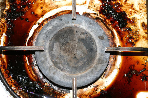 調理中に吹きこぼれたりした食材や調味料がガスの火で熱せられることで炭化したもの。五徳のほとんどが黒いため、パッと見た感じは気がつかないが、よく見ると黒いこげがびっしり何層にもこびりついていることもある。