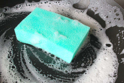 2.スポンジを使い、台所用中性洗剤とぬるま湯で洗う。