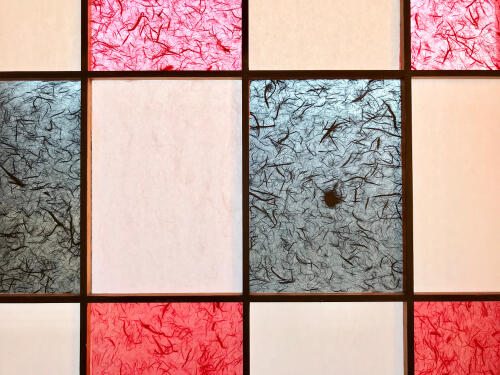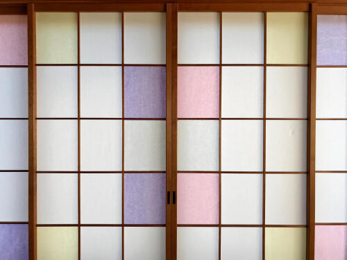カラーのPPシートを使うと、まるでステンドグラスのような障子が出来上がる。カラフルなシートをバラバラに張り付けていけば、とてもポップな室内を作り上げることが出来き、和モダンな雰囲気が醸し出される。