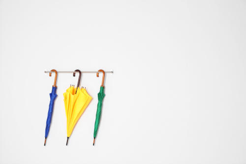 下駄箱の扉の内側に突っ張り棒やタオルバーを取り付ければ、傘を引っかけることができる。玄関付近の壁にタオルバーやレールを取り付けて傘をかけてもよいだろう。また、下駄箱の扉の裏にシールタイプのフックを貼ると折り畳み傘や日傘も収納することができる。