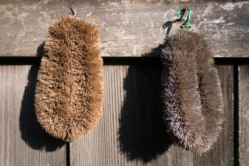 昔ながらのたわしは植物のヤシの繊維で作られているため、新品には粉状の繊維カスが付着している場合がある。そのため、最初は流水でよくすすいでから使うようにしよう。