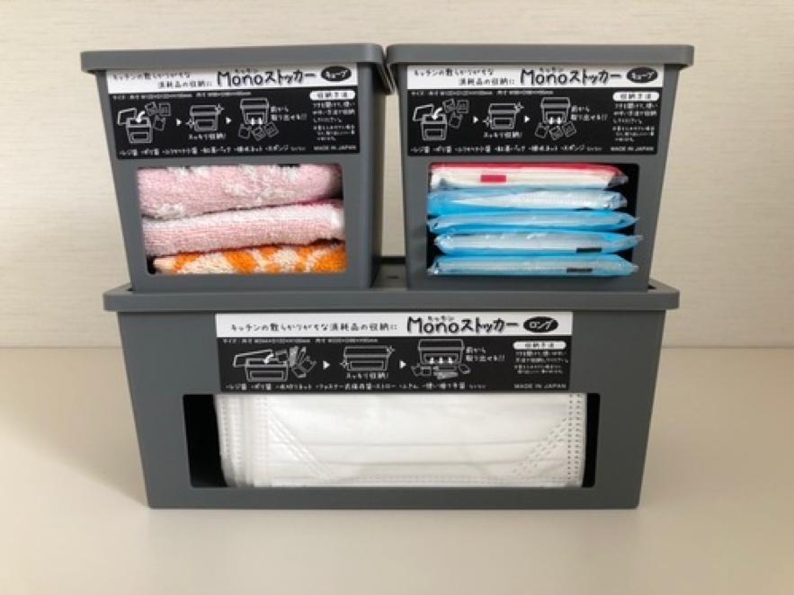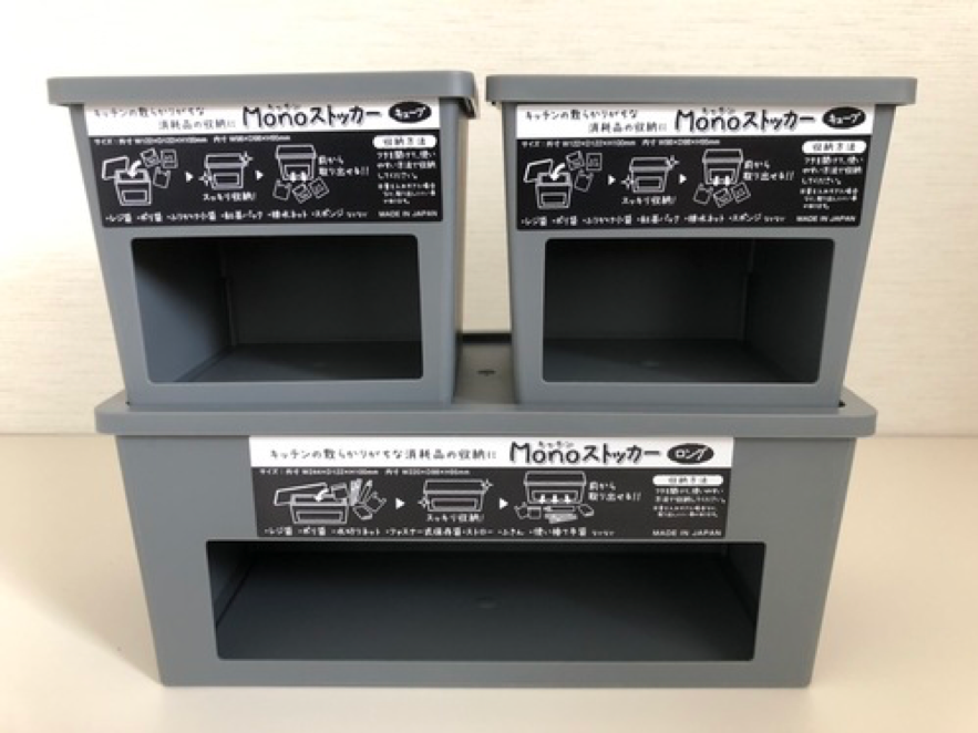 一方でMonoストッカーは横からアイテムを取り出せるので、古くなったものから消費することができる。また、Monoストッカーはボックスが積み重ねられるのも大きな利点だ。ロングタイプの上にキューブタイプが2つシンデレラフィットするように作られているので、プルアウトボックスよりもデッドスペースをつくることなく収納ができるだろう。