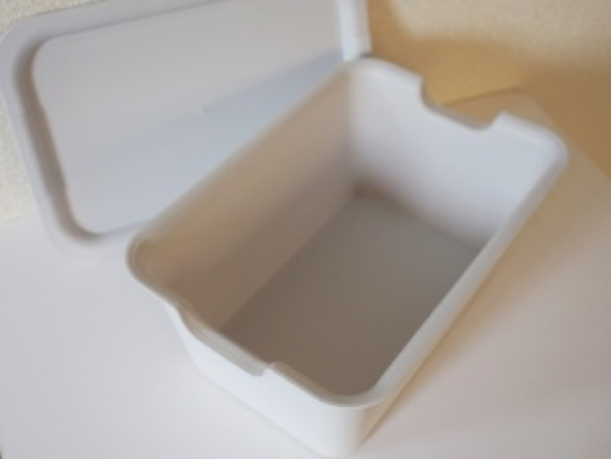 セリアのフタ付きプレーンボックスは本体のサイドにくぼみがあるので、そこに手をかけてフタを開けやすいようになっている。くぼみの下は出っぱっていて持ち運びもしやすい。