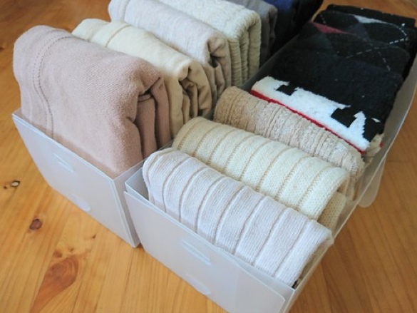 衣類の上手な収納のコツは「立てて収納」すること。立てていれば一目ですべての収納物を見ることができ、使うものを選びやすい。重ねた収納では、下のものを取ると上に重ねているものが崩れがちだが、立てた収納ではスッと取り出せる。