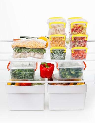 引き出し式の冷凍庫は、同じ大きさの密閉容器に入れたり、フリーザーパックに入れたりして収納するといいだろう。どちらもラベルを貼って立てて収納すると収納量が増え、取り出しやすい。