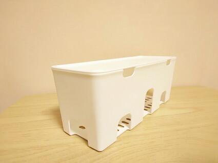 電源タップを収納するだけではなく、パソコンのACアダプター置き場にしたり、テレビ裏の配線を隠すために使ったりと、アイデア次第でさまざまな収納が可能だ。また、このアイテムはふたが付いているのが特徴で、充電中の携帯電話を乗せて置くことができる。底面はメッシュ状になっているため、本体に熱がこもらないのもポイントだ。