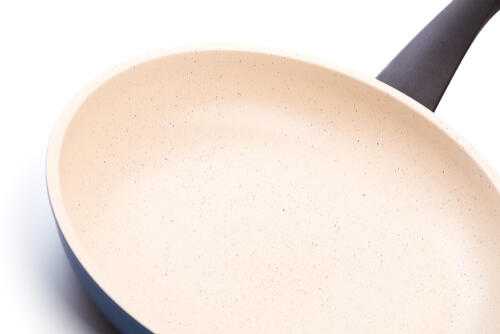 アルミなどの金属で作った本体をセラミックで覆ったもので、焦げ付きにくく汚れが落としやすい。セラミック面が白・ブルーなど、さまざまなカラーバリエーションと豊富なデザインがあり、外見にも拘りたい方に向いている。特徴としては硬質のセラミック使用で、表面に傷が付きにくいことが挙げられる。ただし、調理の際は焦げ付き防止のために、加熱前のセラミック面全体に油を薄く塗る必要がある。