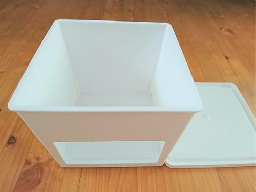 サイズは2種類あって、幅がせまい「キューブ」は外寸が幅12.2×奥行12.2×高さ10.0cm、内寸が幅9.8×奥行9.8×高さ9.5cm。横長タイプの「ロング」は外寸が幅24.4×奥行12.2×高さ10.0cm、内寸が幅22.0×奥行9.8×高さ9.5cm。奥行と高さはどちらも同じで、幅が違い、ロングはキューブの2倍の長さなのだ。