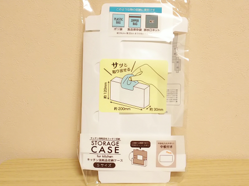 なお、もっと大きめのサイズが欲しい人は、「セリア」のキッチン消耗品収納ケースを使用するとよい。サイズはキャンドゥと同じ Sサイズ、Mサイズの他に、以下の3種類がある。