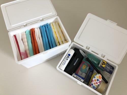 セリアの「フタがとまる収納ケース」はマスク収納や救急箱としても活躍すること間違いなし。マスクは少し幅が合わないが、山折りにして収納すると取り出しも楽になる。また、救急箱として活用する場合は、別アイテムと組み合わせて仕切りをつくるのもおすすめだ。